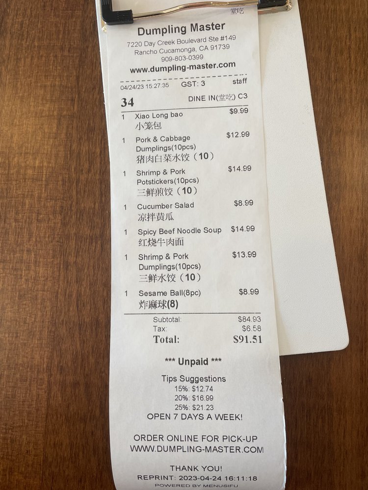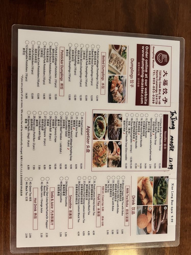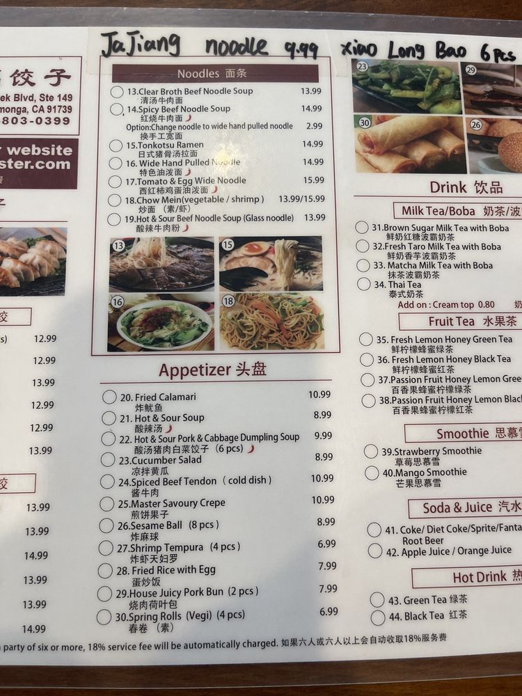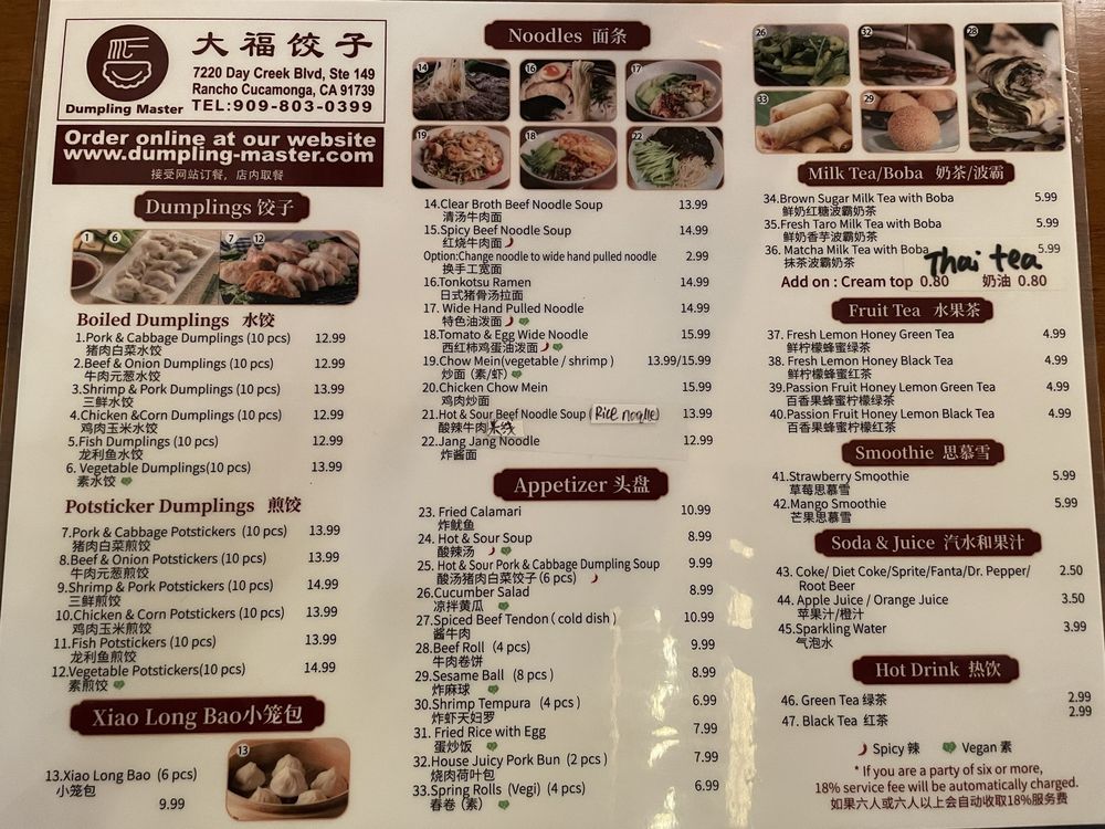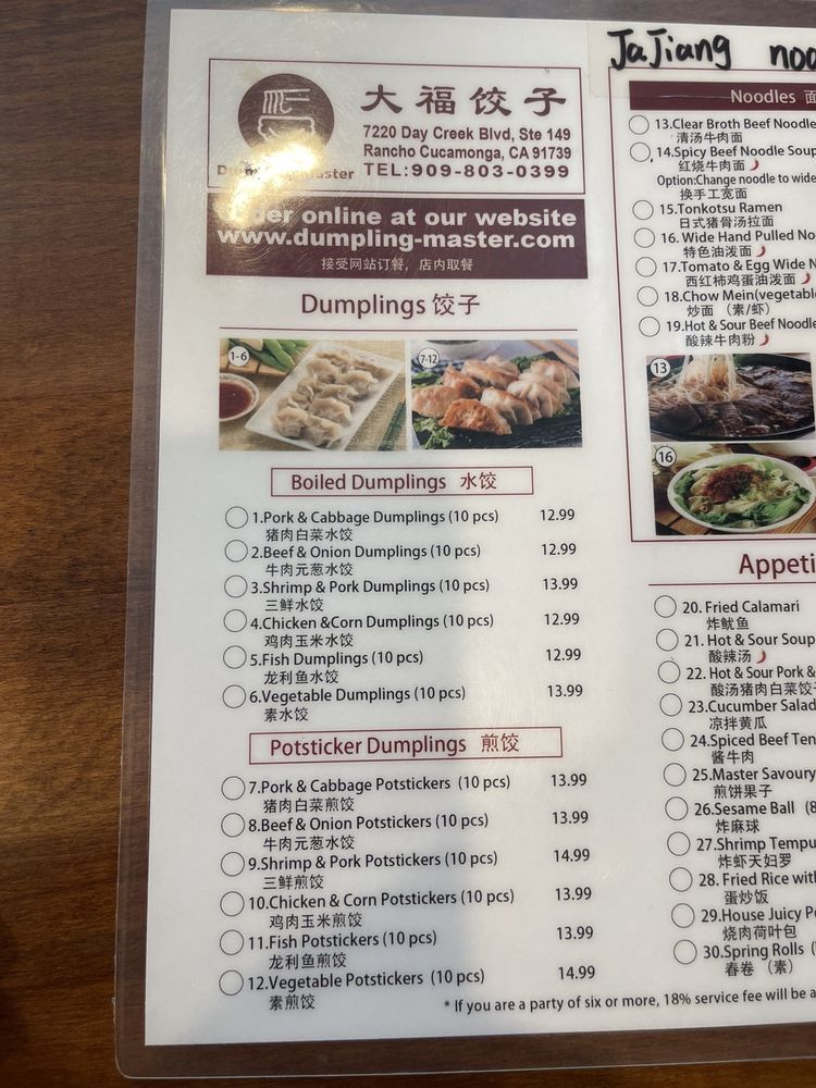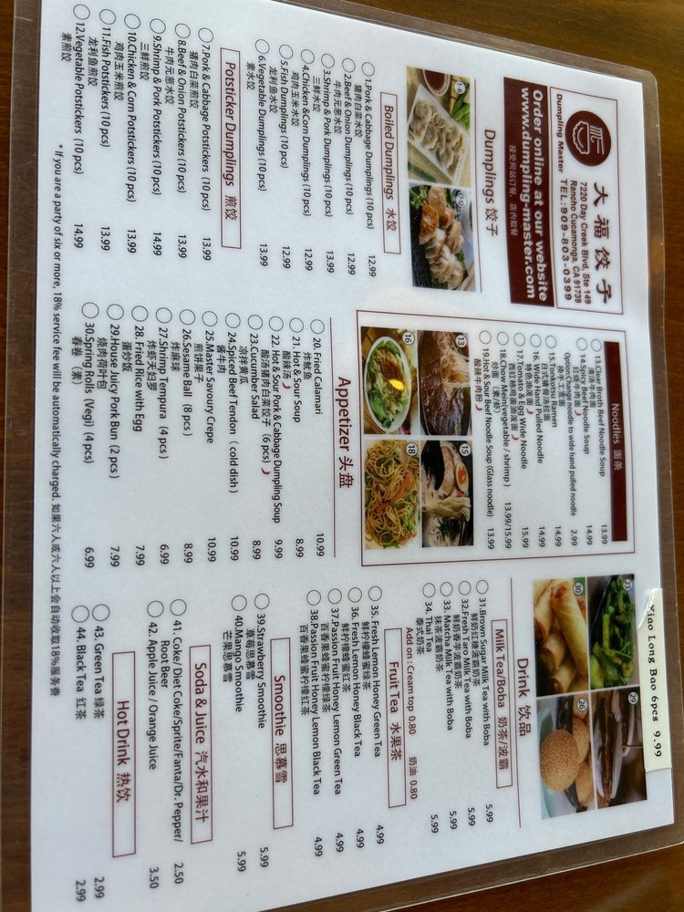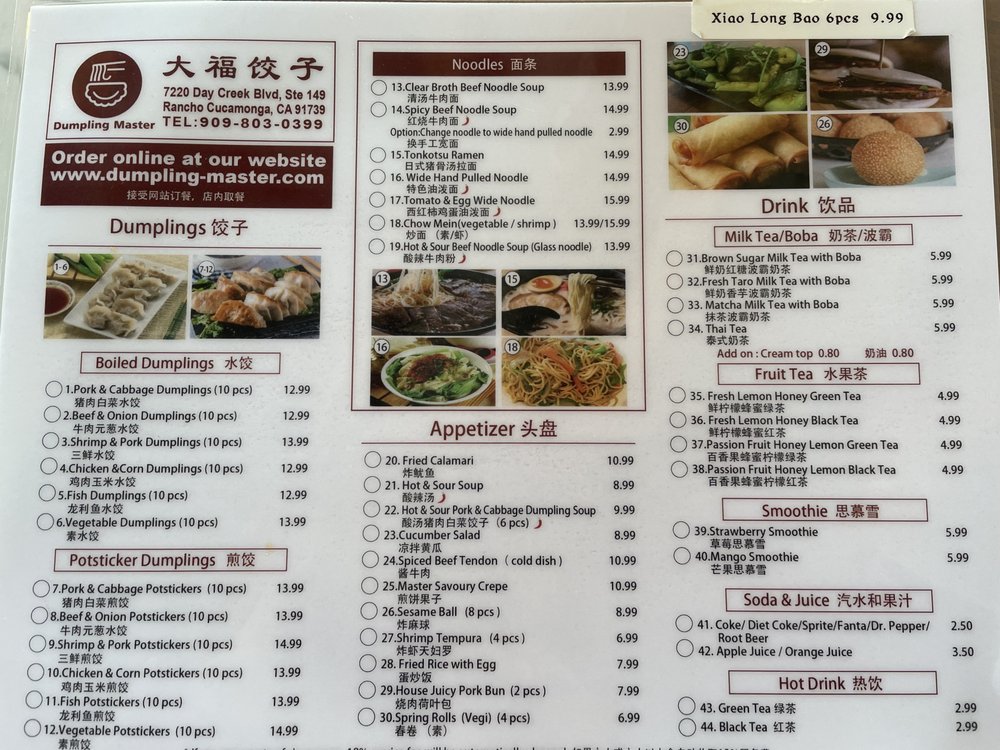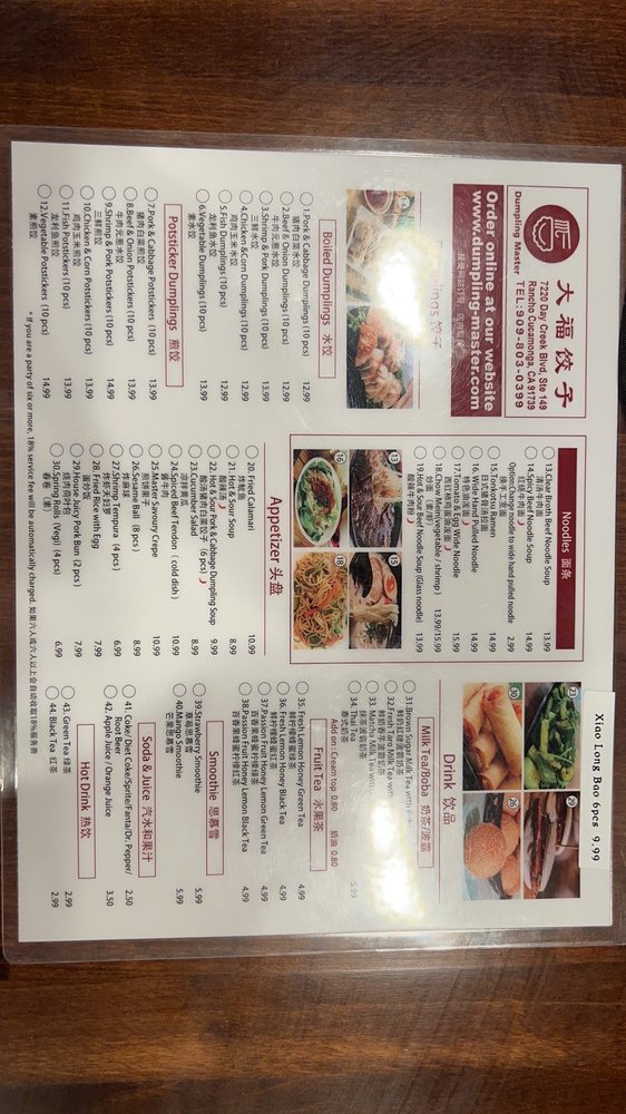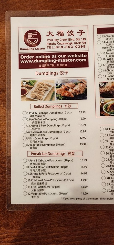 Introducing the menu at Dumpling Master, a must-visit Asian-owned restaurant in Rancho Cucamonga, CA. From delectable dumplings and potstickers like Pork and Cabbage to savory Noodles including Spicy Beef Noodle Soup, the menu boasts a wide range of flavorful dishes. Appetizers like Cucumber Salad and Fried Calamari are perfect starters before diving into the main course. Customers rave about the affordable prices and excellent service, making Dumpling Master a go-to spot for dumpling lovers. With positive reviews praising the delicious food and cozy atmosphere, this restaurant is a top choice for those craving authentic Chinese cuisine. Don't miss out on trying their signature dishes like the Spicy Beef Noodle Soup and Hand Pulled Noodles. For a truly satisfying dining experience, Dumpling Master is the place to be.